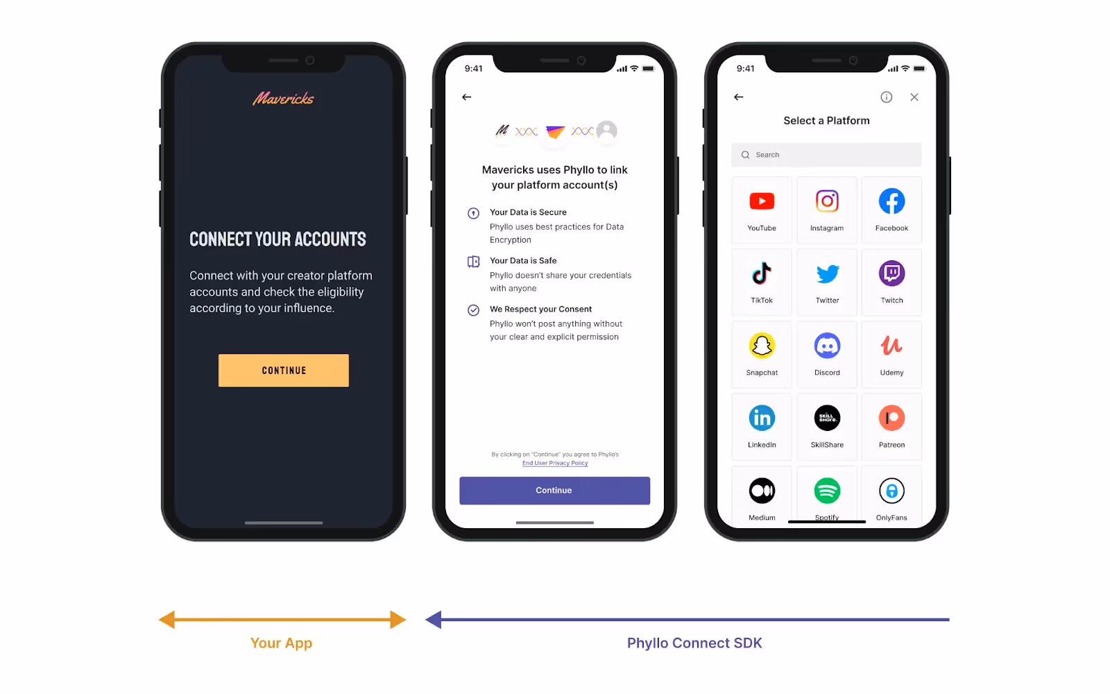 With consent from creators, the API securely transmits the requested data to your application. The data exchange takes place only after creators explicitly agree. Creators can choose to either continue to your app or connect another account.
