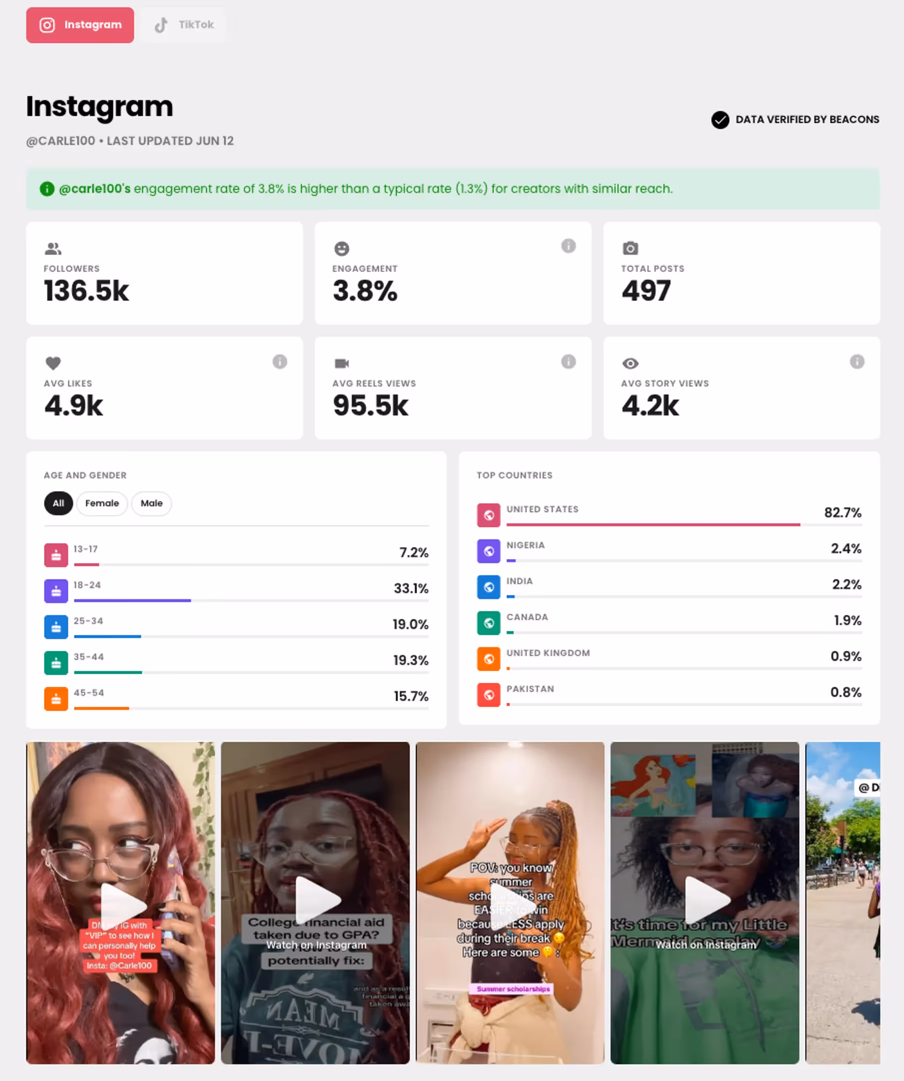 Sometimes creators will preemptively send this information—if they don’t, brands can ask for this information outright. Pitch materials like the Beacons media kit present this information in a clean and clear format, and thanks to an integration with Phyllo, these stats are always up to date, making it easy to review the data and evaluate the opportunity.