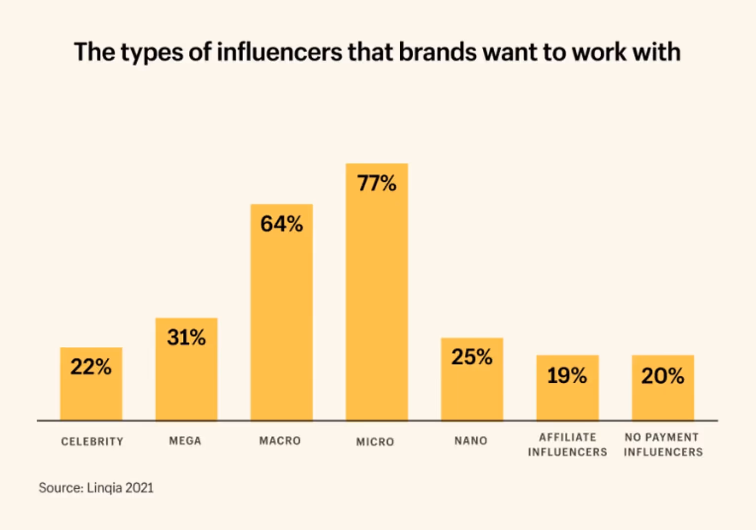 Though micro influencers have smaller audiences than the “big creators” that typically do brand deals, [surveys over recent years] have found that the majority (77%) of marketers say micro influencers are their ideal influencers to work with.