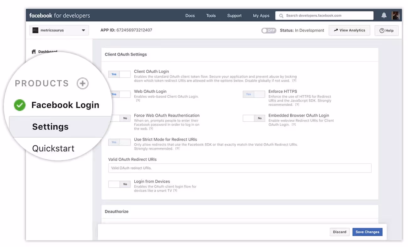 - Click Setup on the Facebook Login product menu and navigate to Settings.