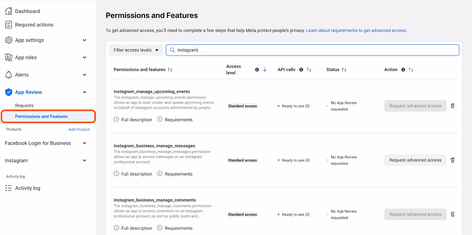 By default, your Facebook app will have basic permissions. To access advanced permissions, you’ll need to request and get approval for those specific permissions.