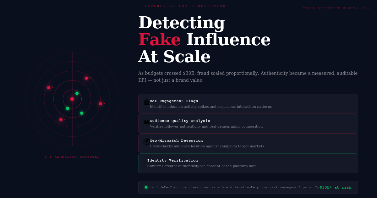 Influencer fraud detection refers to the systematic identification of fake followers, bot engagement, engagement pods, and audience misrepresentation. As influencer marketing budgets have scaled past $30 billion, fraud detection has become a board-level enterprise risk management priority — not just a marketing concern.