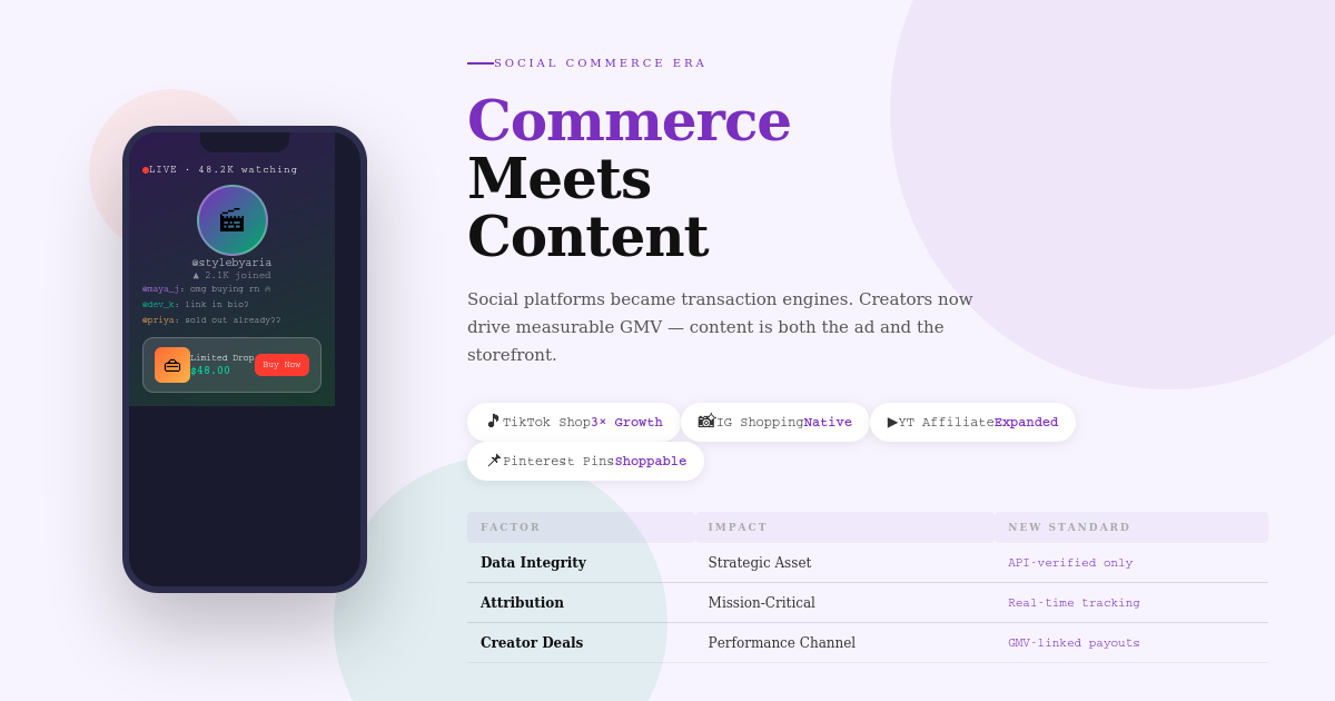TikTok's global breakout in 2019–2020 changed everything. Instagram Reels, YouTube Shorts, Twitch live streaming, live commerce formats, and affiliate storefronts followed in rapid succession.