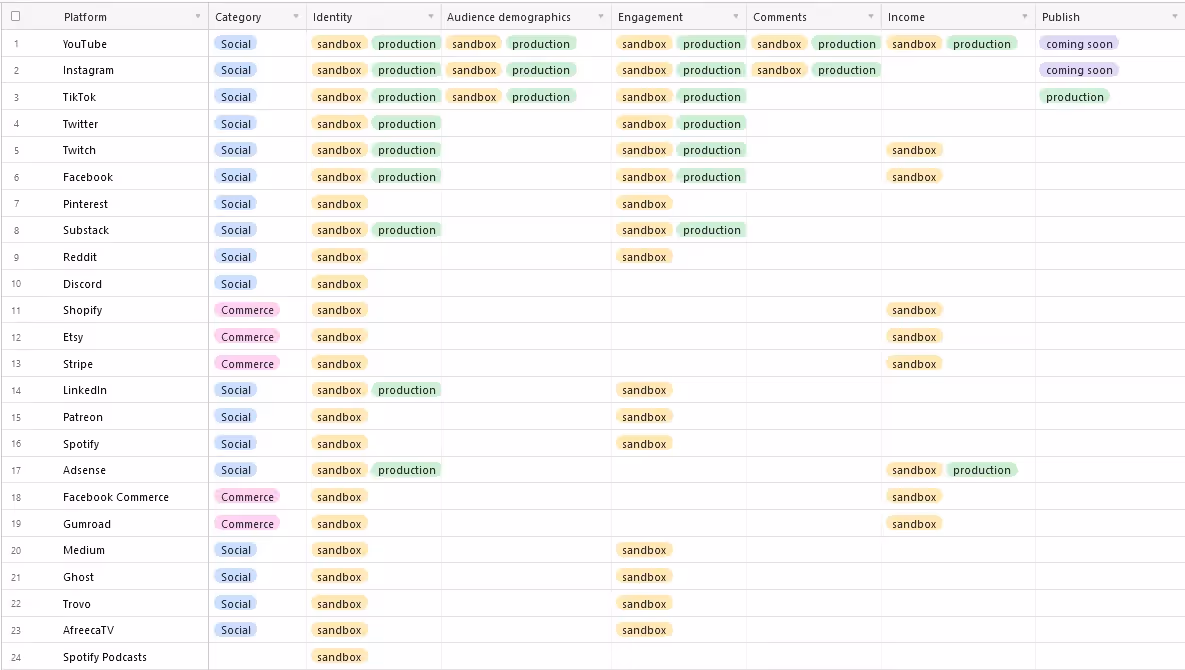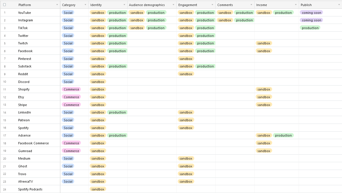 Our platform coverage just got bigger with the addition of Spotify Podcasts. We've introduced Sandbox support for accessing creator identity data from Spotify Podcasts through the Identity API. Check out our full data guide for a platform-wise list of supported products and data attributes.