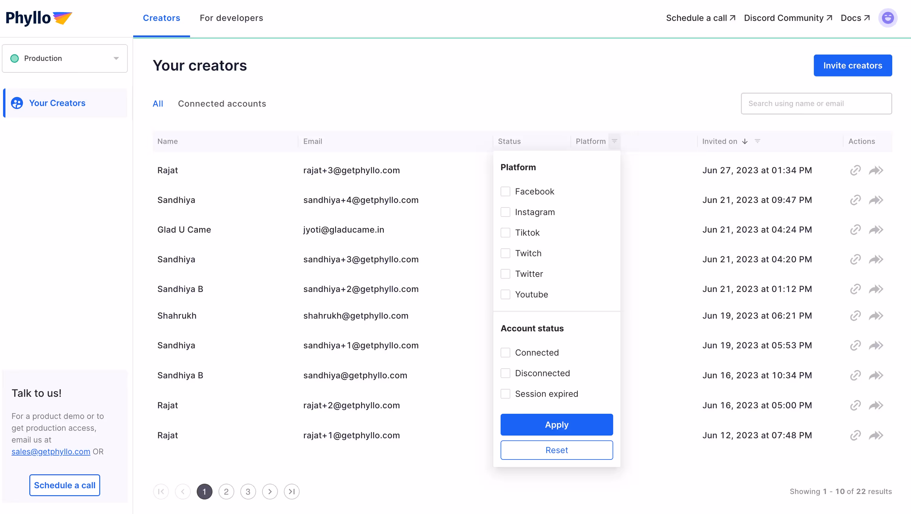 We've implemented a multitude of enhancements to the Creator Linkage dashboard to enable you to save precious time and energy. Firstly, we’ve added filters to display creator accounts based on the connected platform as well as invite dates. You don’t have to go through hoops to check if your desired influencers were onboarded, simply use these filters and check all their connection statuses in real time!