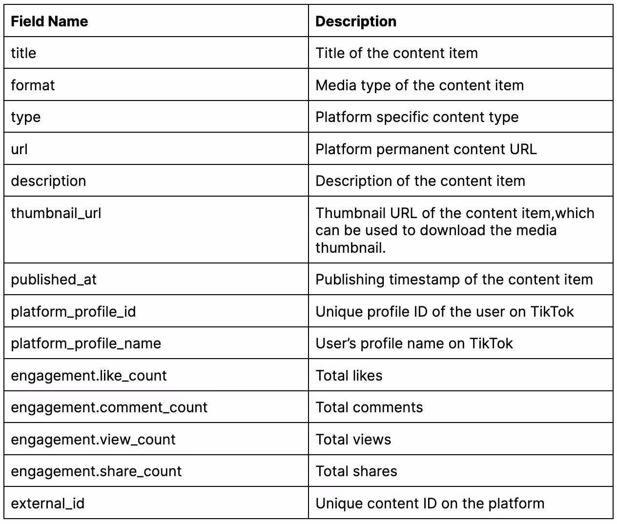 WIth the TikTok API you can access the following data points -
