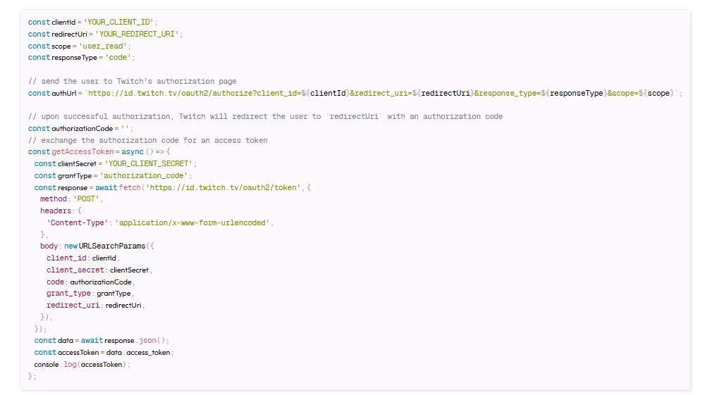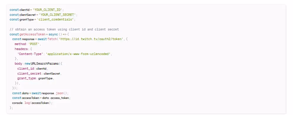 To guarantee the security of user data, you must authenticate your app before using the Twitch API. To that end, you must acquire an OAuth token. You can do this by utilizing an authorization code flow or a client credential flow.