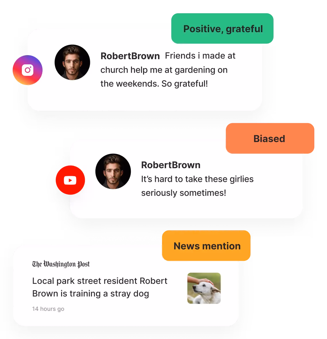 Phyllo generates comprehensive reports that summarize a candidate’s online presence in a structured and easy-to-understand format. These reports highlight key findings, categorize data types, and provide context where necessary, which aids in better interpretation of ambiguous information. This feature ensures that decision-makers receive all relevant insights without the clutter of irrelevant data.