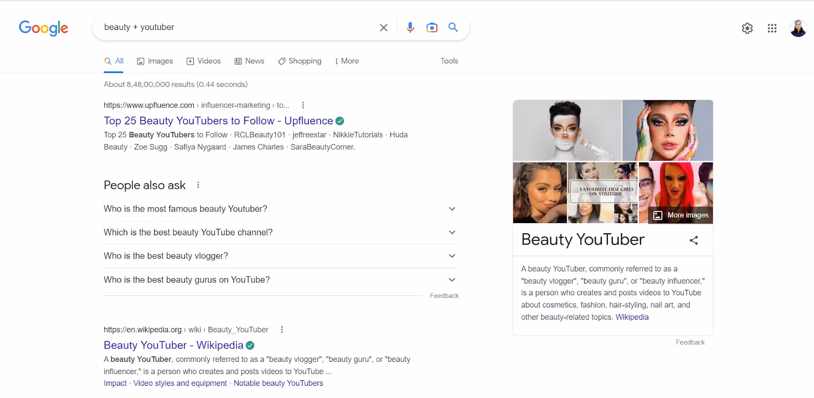 Type keywords related to your industry, add YouTube influencers and check out the results. For example, if you work in the beauty industry, type "Beauty +YouTuber," and you'll see all the relevant YouTubers in your industry.