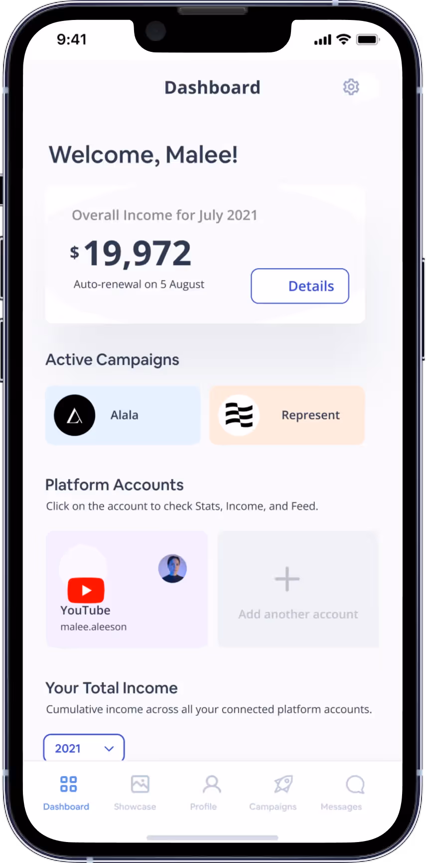 - A homepage enlisting all of the creator’s connected platforms along with an overview of their total monthly income
