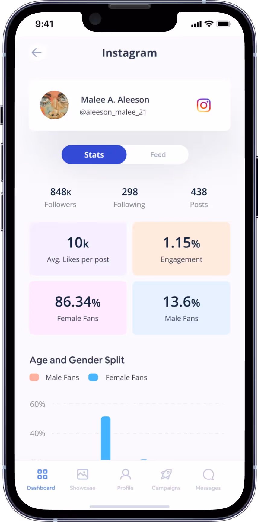 - An in-depth creator dashboard highlighting the creator’s follower count, follower gender segmentation, average engagement rate, and other similar metrics