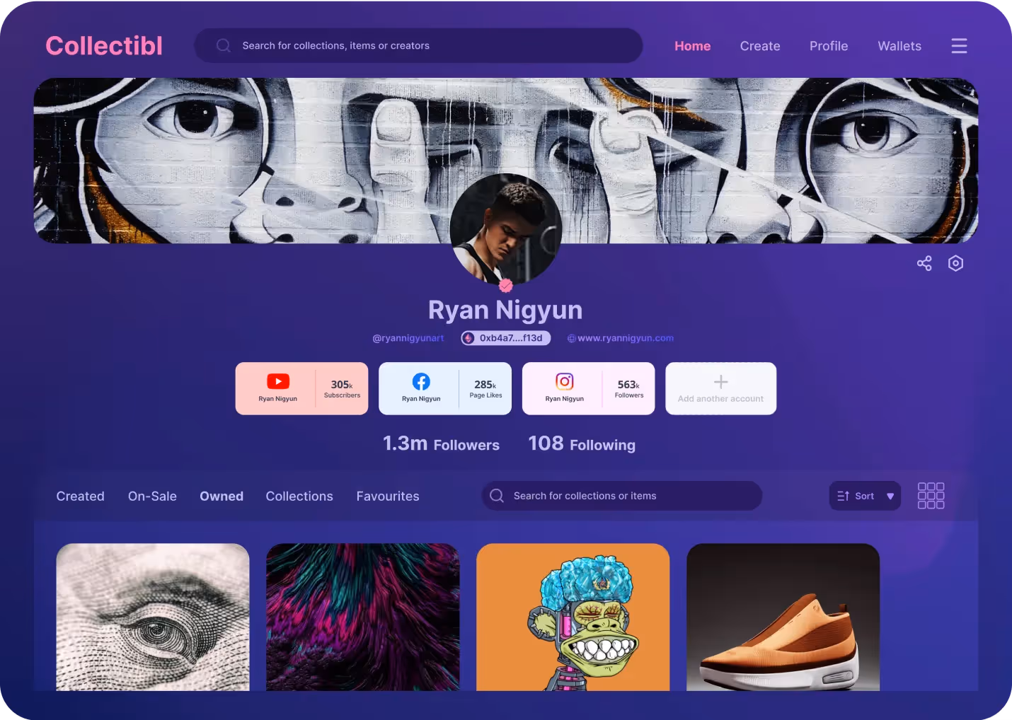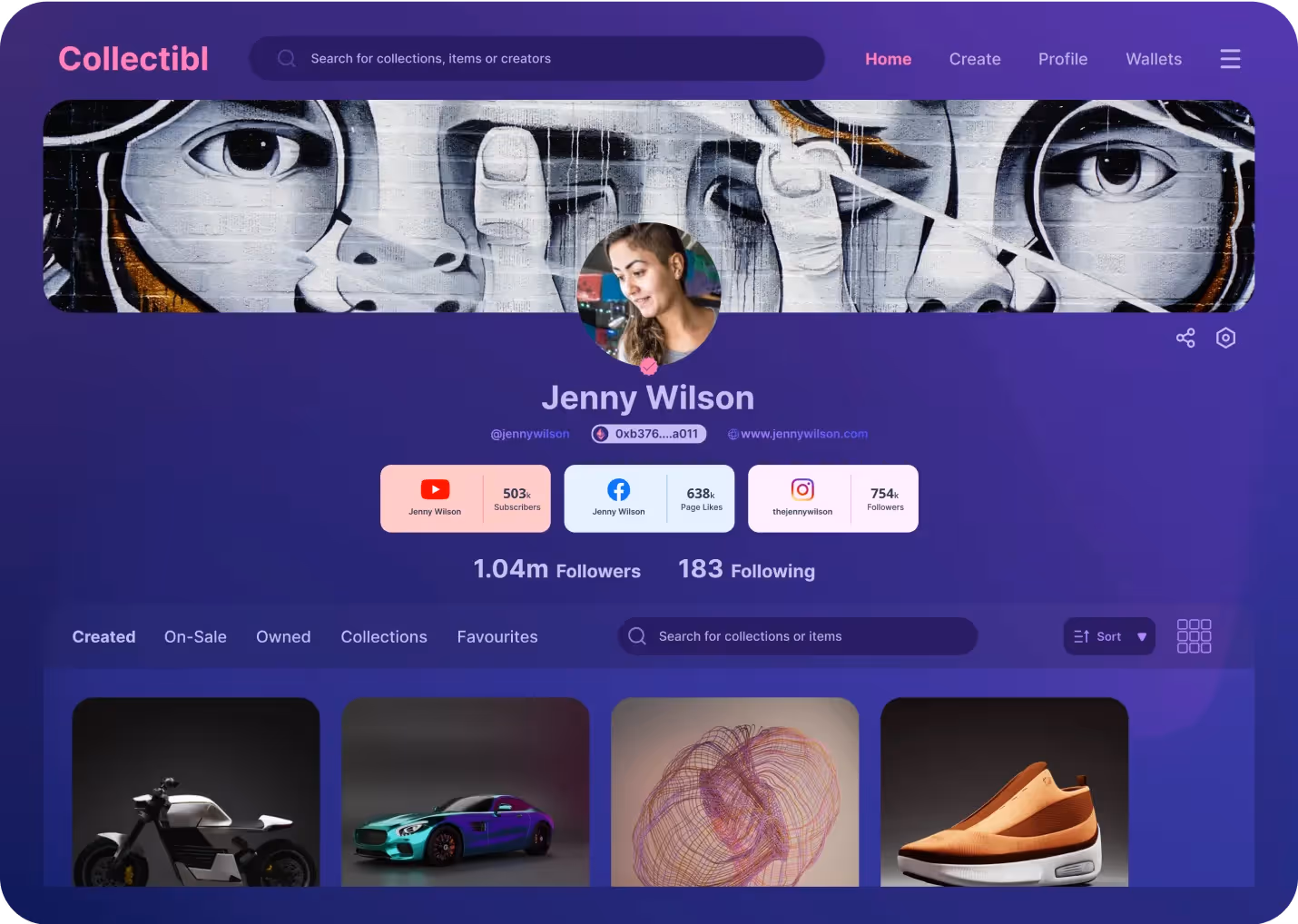 - A creator showcase page that opens if the buyer clicks on the creator’s details. It features all the created NFTs along with the creator’s reputation information such as follower/subscriber count and average engagement rates across platforms